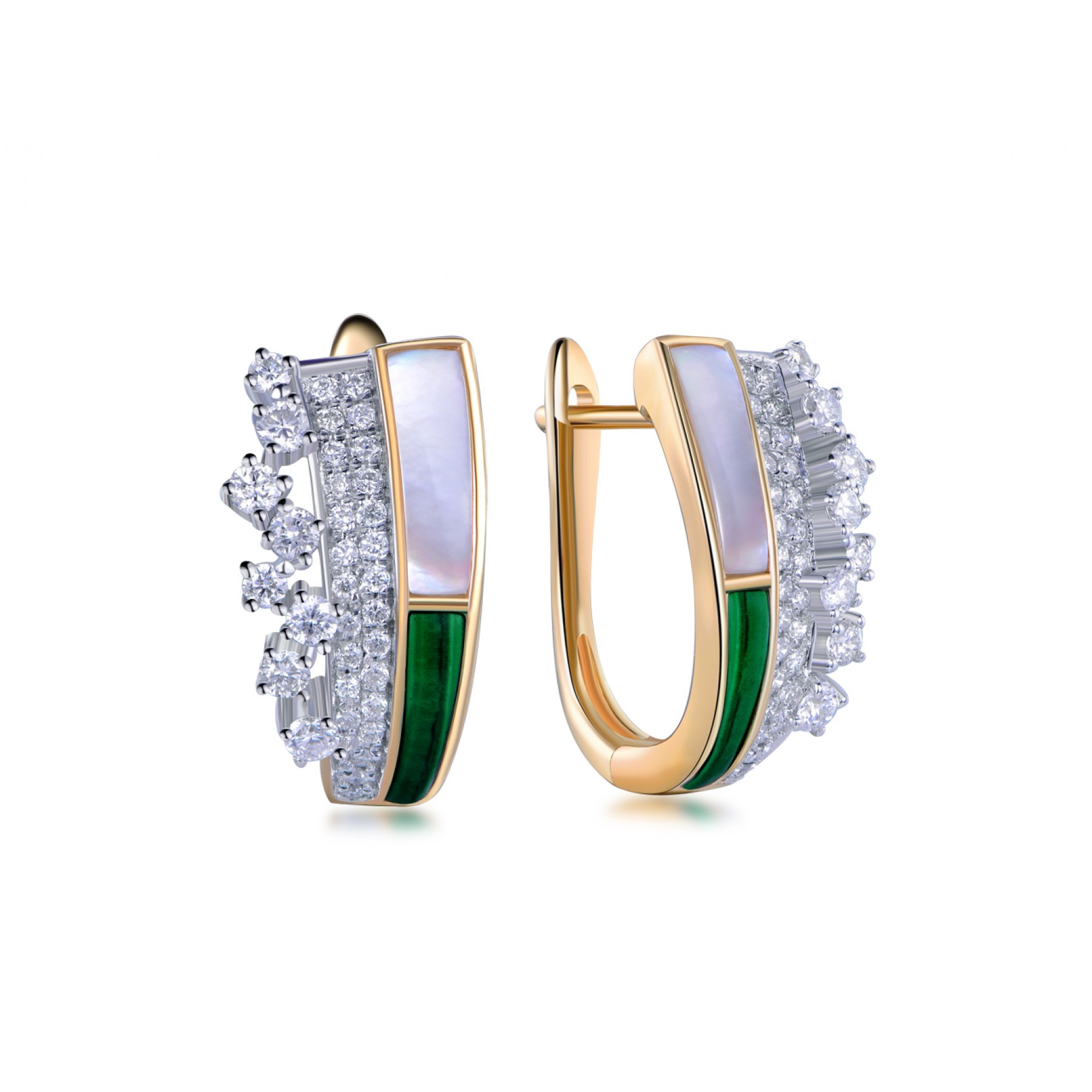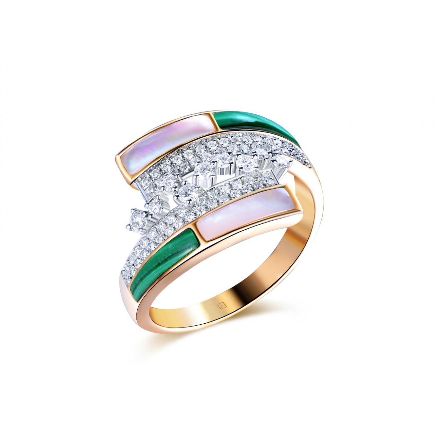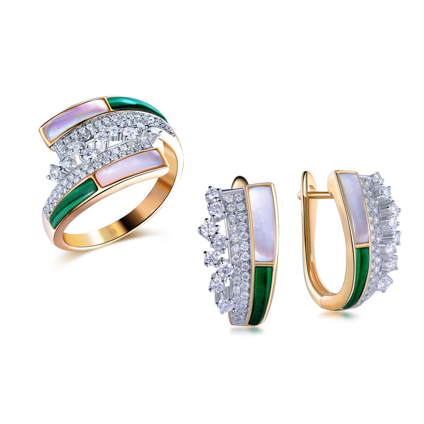 14 Karat Yellow Gold fashion set: ring & earrings with Malachite, Shell and white Diamonds